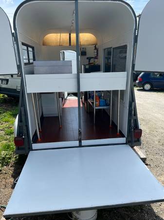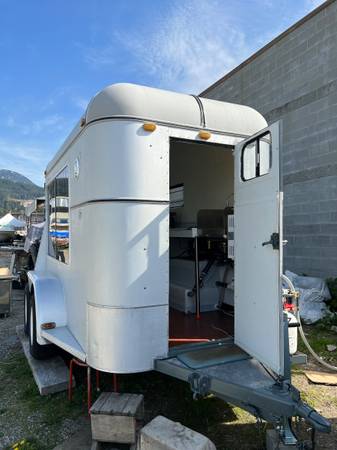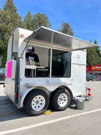 Available for sale or lease, a newly converted double wide Class B food trailer. Fully certified by VCH. Completely new conversion and all new appliances in June 2023. Comes with triple sinks, SS counters, freezer for ice cream or other, small fridge with upper freezer, three burner propane grill, electric and gas steamer, fresh and grey water tanks with pressure pump and macerator discharge pump. Led inside lights. On demand propane water heater. Lots of extraโs. Fully secure entry and serving window with shelter. Open rear upper doors and loading ramp. Shore power with cord. 200 watts roof solar and 100 amp LI battery and inverter for power outages. Ready to do a hot dog, grill cheese or hot sandwiches, ice cream and beverages. Easy tow hitch and new led lights. A good b